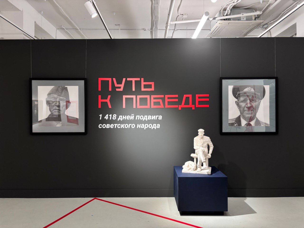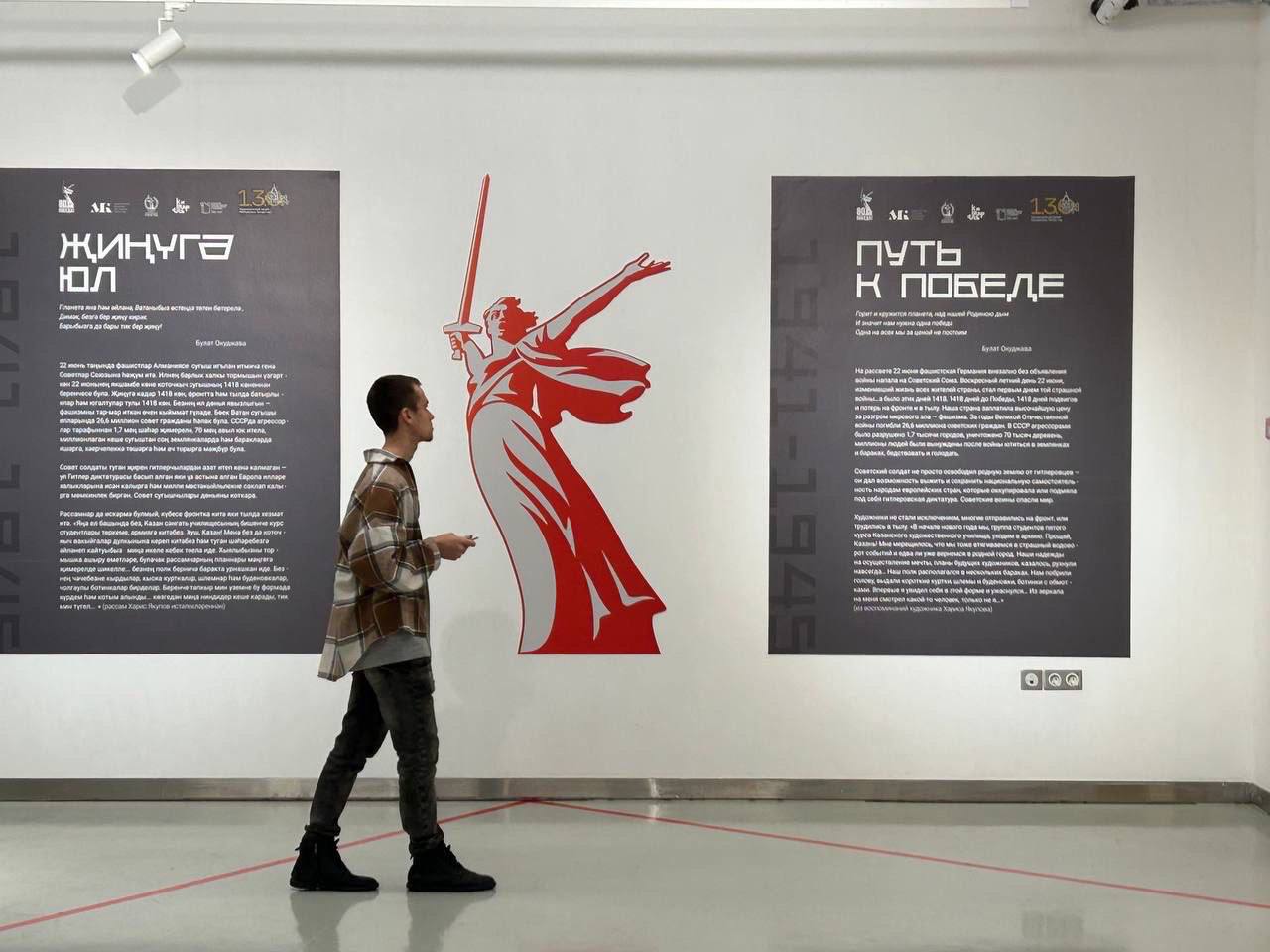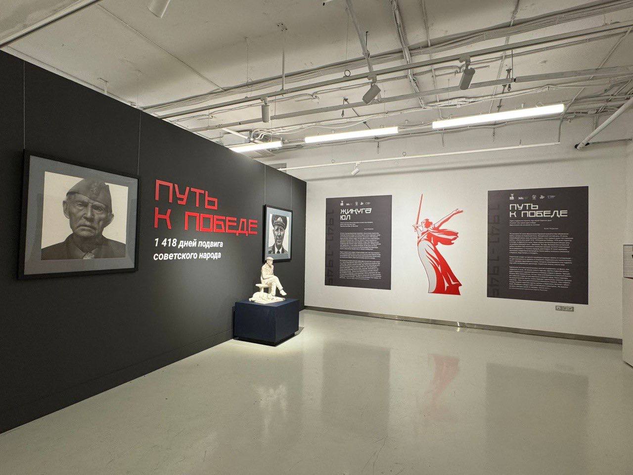 Организаторы выставки концептуально преобразовали пространство одного из залов Национальной библиотеки. Зал разделён шестиметровой стеной, формирующей входную зону. На тёмно-графитовой поверхности крупно выделяется название — «Путь к Победе», выполненное красными буквами. Рядом белая надпись «1418 дней подвига советского народа» создаёт сильный визуальный контраст и напряжение.