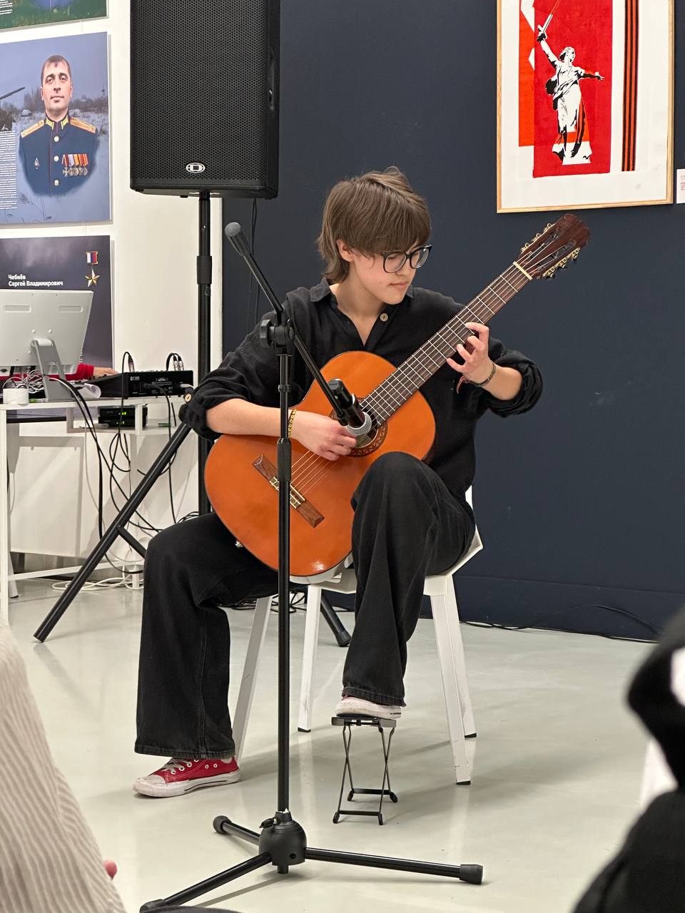 Для полного погружения в атмосферу экспозиции и понимания замысла проекта прозвучали музыкальные номера. Открыл концертную программу ученик 8 класса Сейфудинов Арслан с замечательной песней из репертуара Эдуарда Хиля «Весенний Ленинград». На концерте он великолепно исполнил три песни.