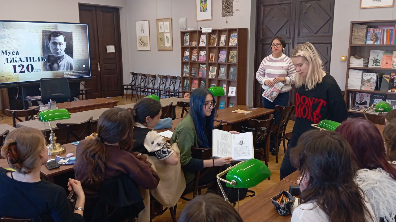 В этом году в Казанском художественном училище имени Н.И. Фешина мероприятия Международного дня родного языка были приурочены к 120-летию со дня рождения выдающегося сына татарского народа, Героя Советского Союза, воина и поэта Мусы Джалиля. В рамках занятий по татарскому языку и литературе студенты вместе с педагогом Розой Закиулловной Салаховой посетили Музей-квартиру Мусы Джалиля. Экскурсия позволила ближе познакомиться с жизнью и творчеством поэта, почувствовать атмосферу времени, в котором он жил и работал. Продолжением программы стали открытые занятия в библиотеке училища под руководством педагога-библиотекаря Лилии Фаруковны Крохиной. Студенты познакомились с экспозицией книг и газет, посвященных жизни и подвигу поэта, а также с изданием его знаменитого сборника «Моабитские тетради».