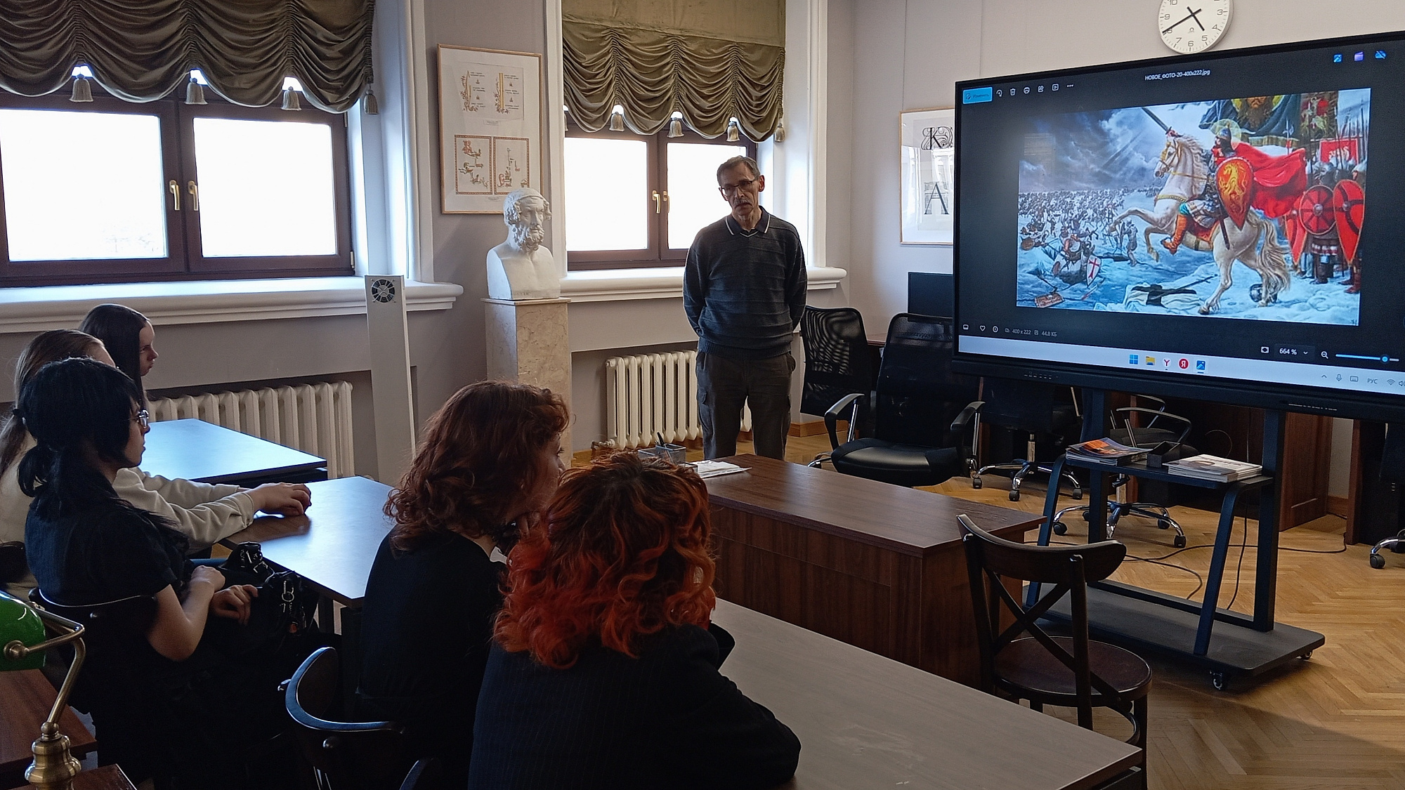 Накануне памятной даты студенты КХУ имени Н.И. Фешина приняли активное участие в патриотических мероприятиях, направленных на сохранение исторической памяти и воспитание уважения к героическому прошлому страны. В рамках уроков мужества «Связь времен и поколений — от Ледового побоища до Битвы за Берлин» живописцы и скульпторы третьего курса под руководством педагога Елены Николаевны Даричевой посетили Мультимедийный исторический парк «Россия — Моя история». Экспозиции парка позволили студентам погрузиться в ключевые события отечественной истории, проследить преемственность поколений и осмыслить роль героических подвигов в судьбе государства.